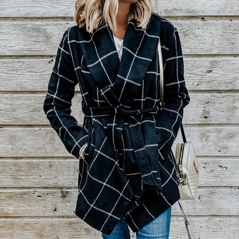 Add an equestrian appeal to your cold weather wardrobe with this plaid women's wrap sweather. Asymmetrical hemline with coordinating belt gives is stunning paired with a tall boot. Falls below the waist for anyone looking for something that works well with your collection of leggings and skinny pants.