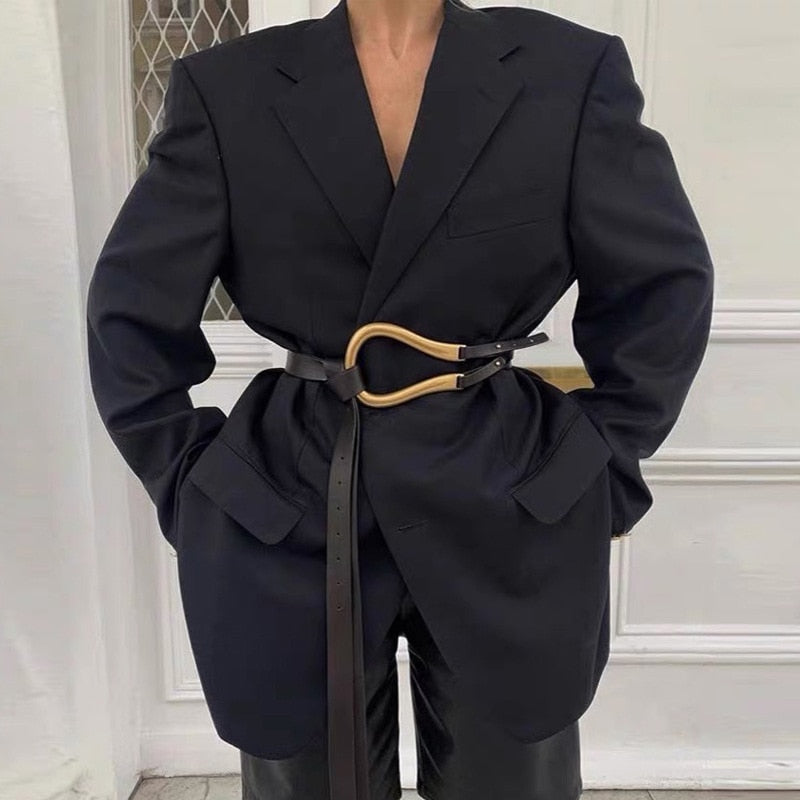 This belt will be your go-to accessory to bring form and style to your ensembles. Double straps wrap around the belt buckle to cinch dresses, long blazers and much more.