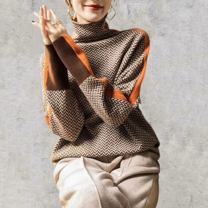 Geometric patterened turtleneck lightweight sweater for the cold months ahead. Stay classic and pair with black slacks or bring in some edge and pair with your distressed jeans. A versatile top that will turn heads either way.