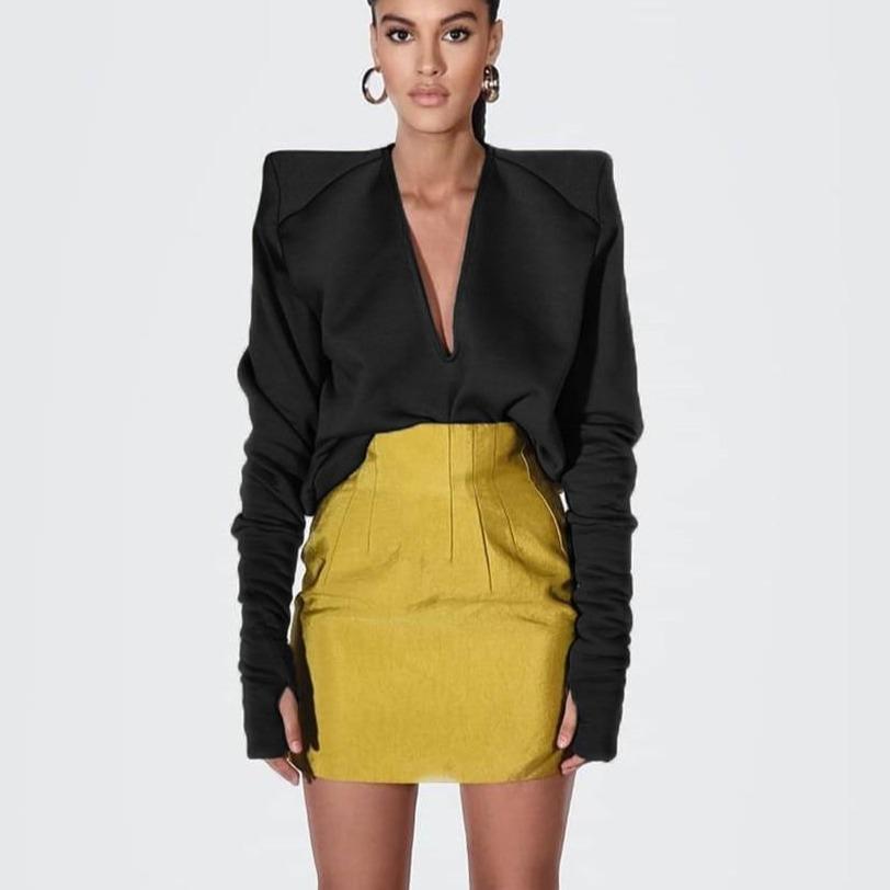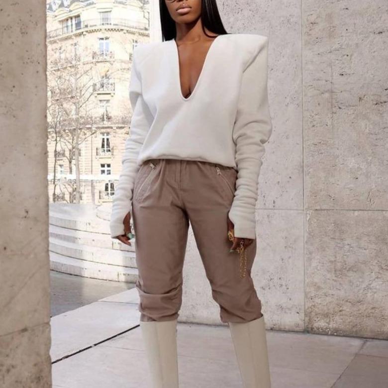 Impressive shoulder pads can add drama and retro elegance to your winter wardrobe. V-neckline with a straigt cut for a unique elegance. Pair with a sleek black skinny pant, pumps and chandelier earrings to complete the look.
