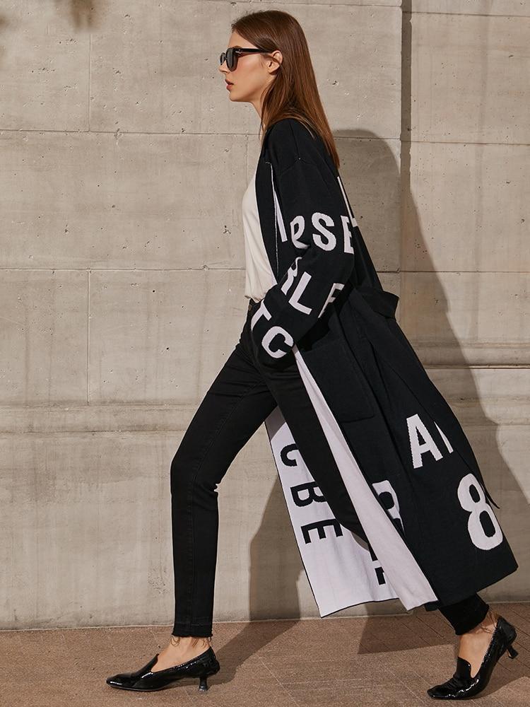 A long belted cardigan with lettering detail will bring an artsy vibe to your winter wardrobe. Removable belt you can use to cinch or lay loose for a more effortless edit. A great layering piece that's edgy, urban and elegant all in one.