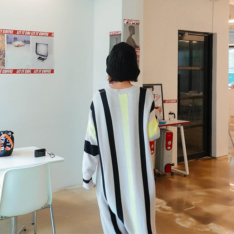 Stay stylish while staying comfortable with a sweater dress that makes getting dressed easy. Yellow and black stripe detail pop against the warm beige color base. RSVP yes and enjoy.