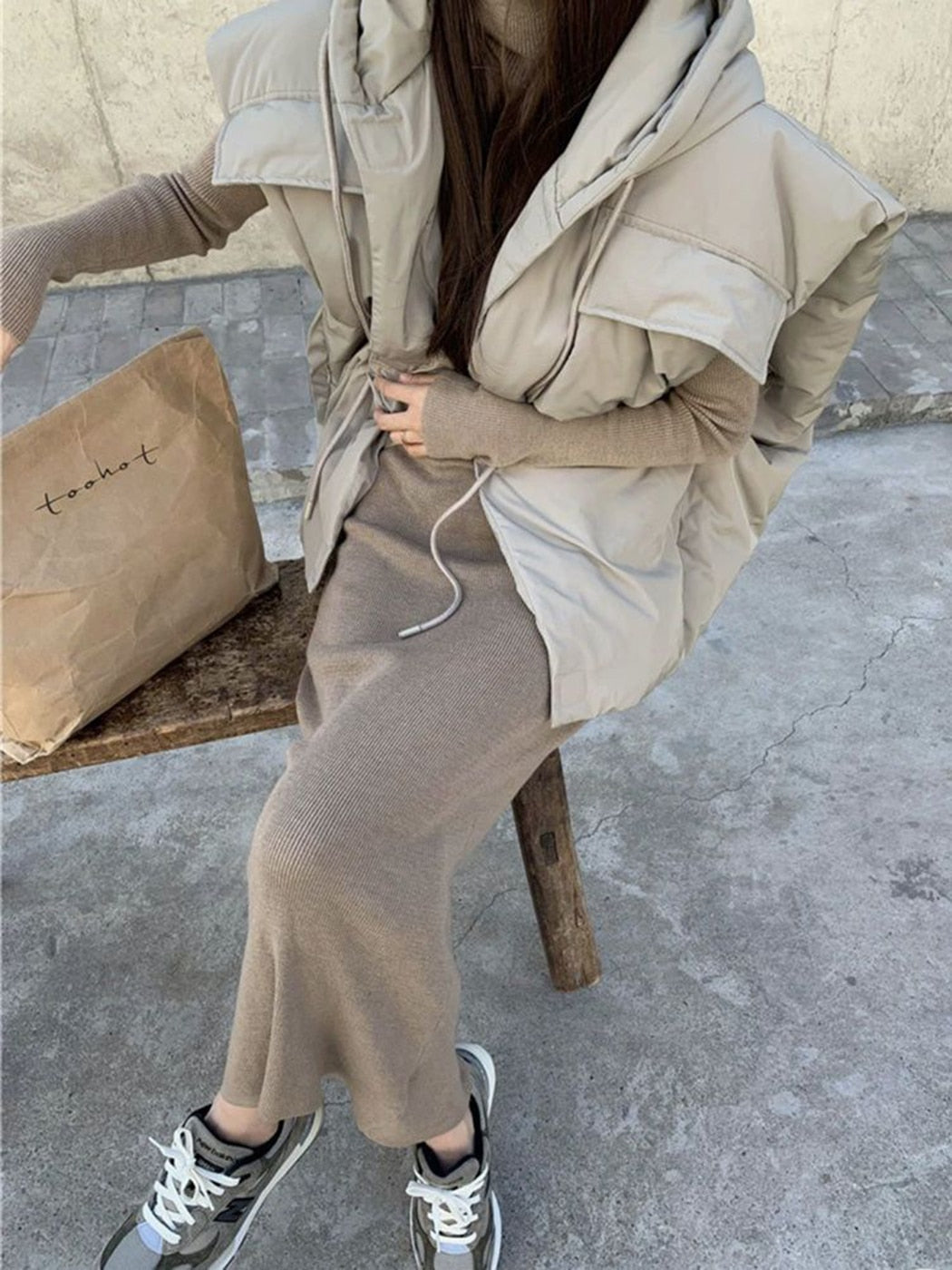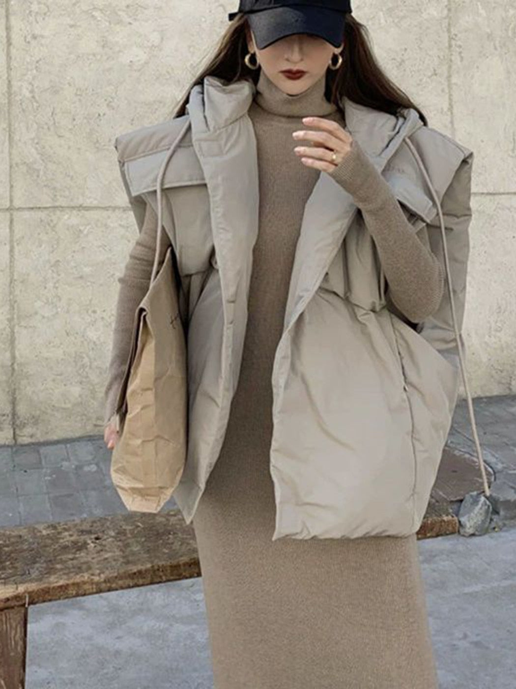 Add safari elements to your winter wardrobe with this puffy vest. Chunky front pockets with drawstring hood combines the look of sport and adventure. Pair over jeans and a bodysuit and you're ready to go.