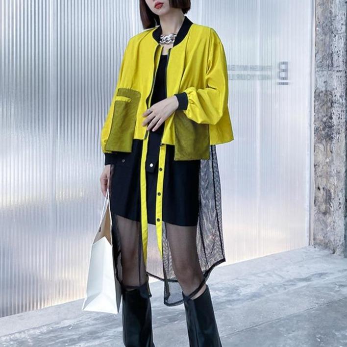 When the dress code calls for style, you'll be glad to have this shirt jacket in your wardrobe. Bomber flight jacket up top with sheer bottom. Large front pocket detail adds even more dimension to this unique style. Pair over a simple black dress and knee boots to complete the look.