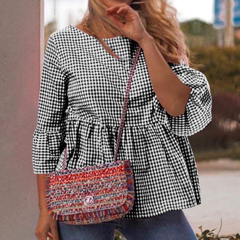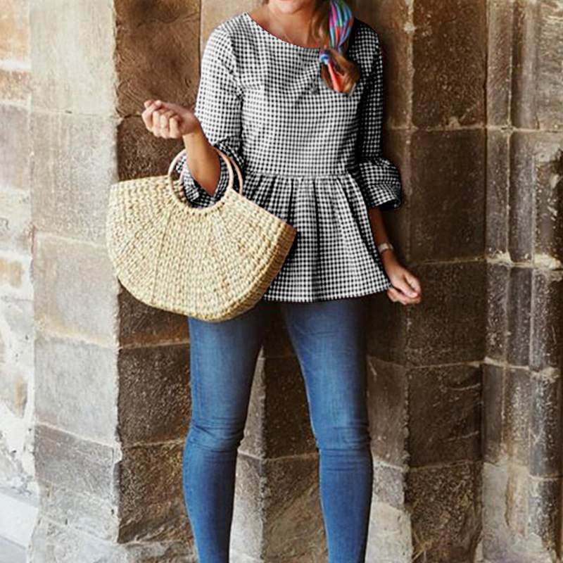 Gingham print is a wardrobe essential to get you ready for an event-packed summer. Peplum silhouette with ruffled sleeves adds a feminine touch to any ensemble. Pair with jeans and a straw bag and you'e ready for brunch, outdoor shopping or a chic stroll in the park.